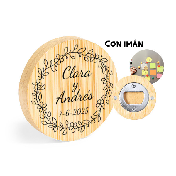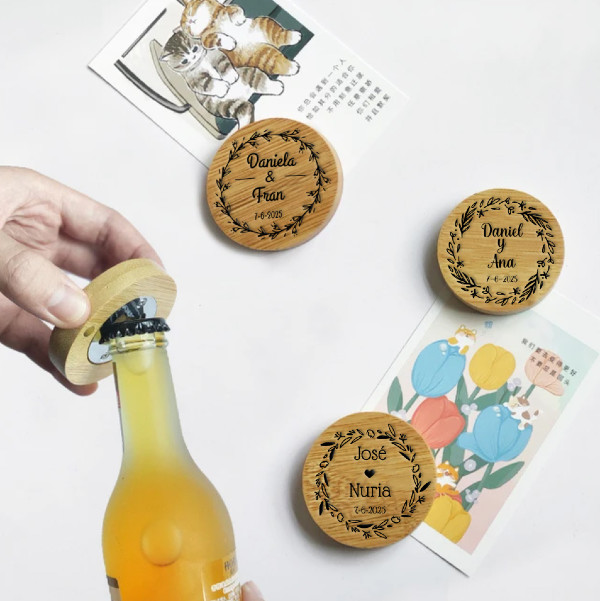 Llega el día de tu boda y no sabes que regalar o que detalles tener con la gente, nosotros te lo ponemos fácil. Estos abridores personalizados de madera con imán de bambú te salvarán de regalar cosas insignificantes que guardarán en un armario o que seguramente cualquier día tiren a la basura.
