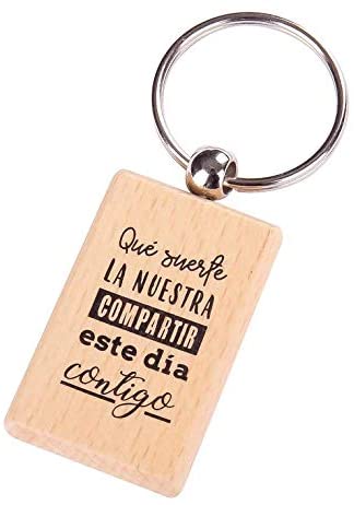 Lote de 20 Llaveros de Madera con Frase «Que suerte la nuestra compartir este día contigo». Llaveros con Frases Originales para Bodas, Bautizos, Comuniones y Cumpleaños. Un detalle único y práctico.